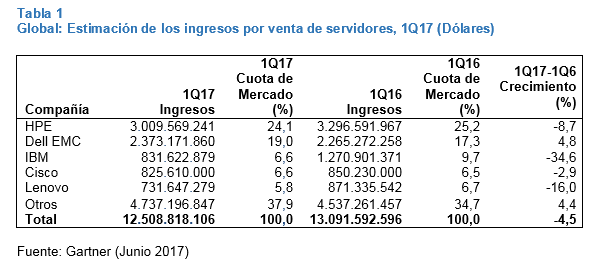 En el primer trimestre de 2017, los ingresos de los servidores en todo el mundo disminuyeron un 4,5%, mientras que las ventas cayeron un 4,2% con respecto al primer trimestre de 2016, según Gartner.