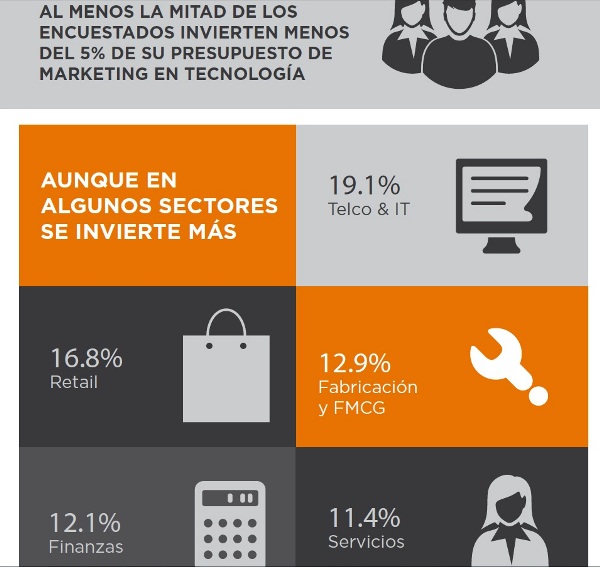 Esta investigación también ha puesto al descubierto que la transición hacia los canales digitales y la creciente importancia de los datos han llevado a la definición de una «estructura de clases» en lo que refiere a la inversión en tecnología de marketing para las empresas que utilizan estas soluciones. Las organizaciones TIC invierten cerca del 20% de su presupuesto de marketing en mejorar su infraestructura; le sigue la inversión en retail (17%) y las finanzas (13%). Sin embargo, hoy en día, el 50% de los departamentos de marketing implicados que opera en diferentes sectores gasta menos del 5% de su presupuesto en mejorar sus actividades de marketing de cara a las inversiones en tecnología.