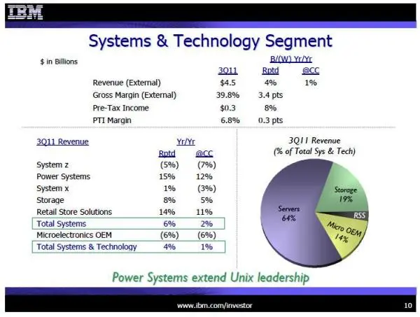 “Los mercados emergentes han tenido unas cifras de ventas excelentes, en hardware, software y servicios, y ello ha contribuido a que la compañía haya ampliado los márgenes. Asimismo, hemos obtenido unos fuertes resultados en Smarter Planet, en analítica de negocio y en cloud computing. Por todo ello, estamos aumentando nuestras expectativas del beneficio por acción para finales de 2011 de hasta 13,35 dólares por acción”,ha afirmado Samuel J. Palmisano, presidente y CEO de IBM.