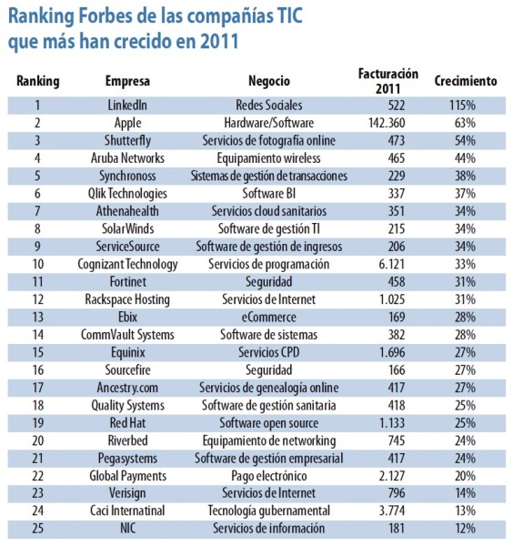 Forbes ha publicado el ranking de las compañías tecnológicas que mayores crecimientos han experimentado durante 2011, al haber registrado los mayores incrementos en sus ventas, superando la gravedad de la crisis económica. En paralelo y con una perspectiva más local, desde COMPUTING hemos querido incluir también el listado de las empresas que más crecieron en España.