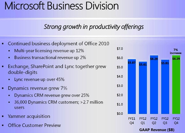 En el ejercicio fiscal de 2012 completo Microsoft ha ingresado una cifra récord para la compañía: 73.720 millones de dólares, que es un 5% más que en 2011. Y en el cuarto y último trimestre también ha tenido una facturación de récord: 18.060 millones, que es un 4% más. Sin embargo, esa no es la noticia.