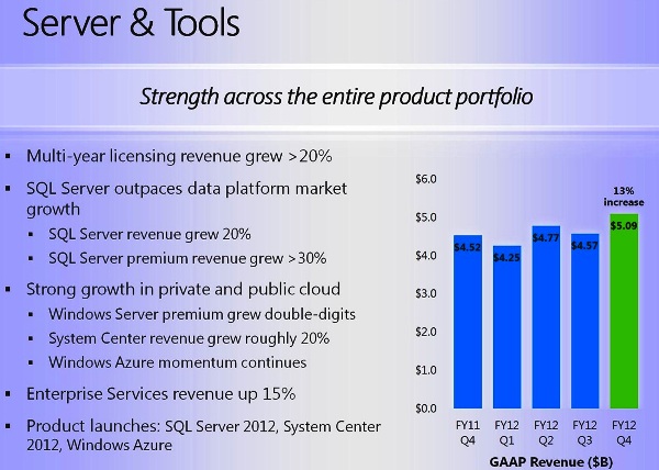 Al igual que Intel, cuyos resultados económicos se han salvado por el negocio de CPD, las ventas en el mercado empresarial han impulsado la facturación de Microsoft. De hecho, la división de Servidores y Herramientas ha experimentado un incremento de sus ventas del 12% en todo el año. Según Redmond, las empresas de todo el mundo están invirtiendo en SQL Server y System Center para soportar sus cargas de trabajo de misión crítica, y desarrollar su inteligencia de negocio y la infraestructura de nube privada.