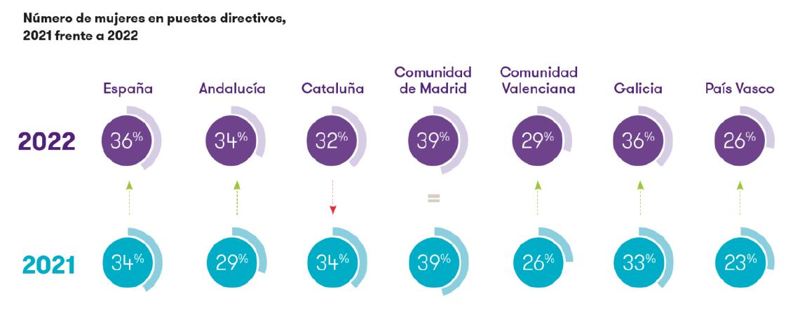 A nivel nacional, España registra en 2022 el mayor número de mujeres en la alta dirección con un 36%, tras dos años de estancamiento en el 34%, provocado por el COVID-19, y superando a la media europea (33%) y global (32%). Tras este ascenso, España recupera su posición como uno de los diez países con más presencia femenina en la alta dirección de sus empresas. Concretamente, ha escalado del puesto 14 al 10, superado por los siguientes países: Sudáfrica (42%), Turquía (40%), Malasia (40%), Filipinas (39%), Indonesia (38%), Tailandia (38%), India (38%), Brasil (38%) y Nigeria (38%).