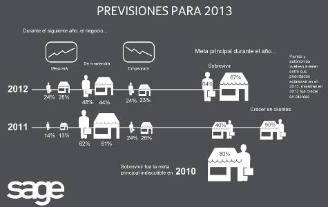 Perspectivas de futuro Con estos resultados, sobrevivir vuelve a ser el principal objetivo para pymes y autónomos en un 2013 decisivo para la economía española, con un 65,5% de las respuestas, en comparación con el 40% del año anterior y del 80% en 2010. De esta manera, las esperanzas de salir de la crisis se dibujan un año más en un horizonte lejano. Según el 55% de las pymes y el 46% de los autónomos, el inicio de esta recuperación dará comienzo a partir de 2015. Por lo que no será hasta el 2020 cuando se alcance de nuevo la estabilidad económica previa al inicio de la crisis.