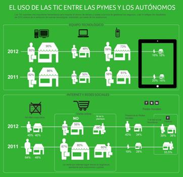 El boom de las redes sociales no ha dejado indiferentes a pymes y autónomos. Si en 2011 era un 23,5% de pymes y autónomos que apostaban por estas herramientas online para promover sus actividades comerciales, ahora es un 38,5%, lo que significa un aumento del 15%. Facebook es nuevamente la red social favorita para pymes y autónomos, con un 33,5%, en comparación con el 18,5% del año inmediatamente anterior. Una tendencia que contrasta con la disponibilidad de una página Web empresarial. Es así que en 2012, un 45% de autónomos y un 40% de pymes aún no disponen de una Web corporativa, frente al 50% de 2011. La falta de una plataforma online ha llevado al 60% de autónomos y el 56% de pymes a no estar interesados en vender por Internet y, por ende, a no aprovechar las posibilidades de internacionalización y crecimiento que brinda el comercio electrónico.
