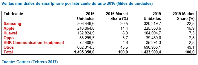 Se trata del segundo trimestre en que cae Samsung. Entre octubre y diciembre, la firma coreana comercializó 76,7 millones de celulares, casi 7 millones menos que en la recta final. En todo el año, Samsung vio como sus ventas caían casi un 3%. “La decisión de parar la comercialización del Galaxy Note 7 frenó las ventas en el cuarto trimestre. Y es que esta decisión dejó un vacío en la oferta de Samsung en el ámbito de teléfonos de gran pantalla”, asegura Anshul Gupta, jefe de investigación en Gartner. Samsung además está soportando la fuerte competencia de fabricantes como Huawei y Oppo en el ámbito de los teléfonos de gama baja y media.