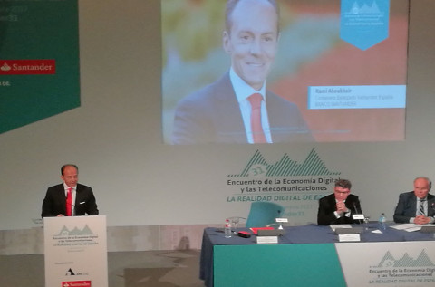 Rami Aboukahir, consejero delegado de Santander España, en representación de Banco Santander, como empresa colaboradora del 31 Encuentro (que releva a Telefónica en el cargo), ha hecho alarde de todo un arsenal digital envidiable. No en vano, la segunda entidad bancaria de España invierte al año 1.300 millones en innovación en proyectos relacionados con la Inteligencia Artificial, Internet de las Cosas, cloud, Blockchain y pagos móviles.