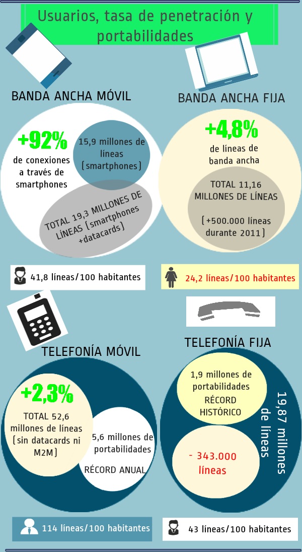 El segmento que más ha crecido ha sido el de las conexiones de banda ancha móvil a través de los smartphones, con un 92% más de líneas, hasta los 15,9 millones de líneas de datos conectadas activamente a Internet a través del móvil. Por su parte, las líneas datacards y USB permanecieron estables en los 3,4 millones.