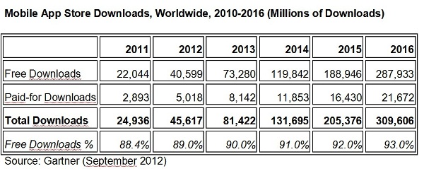 Según datos de Gartner, las aplicaciones gratuitas representarán el 89% de las descargas totales este año, que en todo el mundo, moverán un volumen de negocio de 45.600 millones de dólares. Las descargas gratuitas representan 40.100 millones.