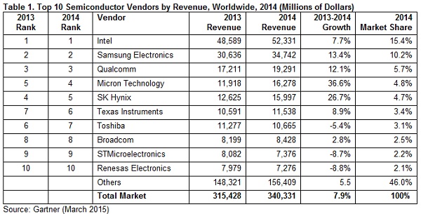Los ingresos del mercado de semiconductores totalizaron 340.300 millones de dólares en 2014, un 7,9 por ciento de incremento con respecto a los 315.400 millones de 2013, de acuerdo a los resultados finales publicados por Gartner. Los 25 primeros proveedores subieron sus ingresos combinados en un 11,7 por ciento, un aumento mayor que el experimentado por el total de la industria. Estos suministradores contabilizan el 72,4 por ciento del total del mercado, con una ligera subida desde el 69,9 por ciento que tenían en 2013.