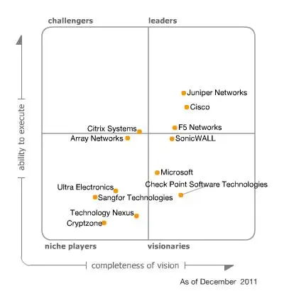 En la edición de este año, Gartner ha reconocido como proveedores Líderes del mercado de soluciones SSL VPN a Juniper Networks, Cisco y F5 Networks; en el área de Challengers sólo ha situado a Citrix Systems; en el cuadrante de Jugadores de Nicho ha identificado a Array Networks, Ultra Electronics, Sangfor Technologies, Technology Nexus y Cryptzone; y en Visionarios, la consultora ubicado a SonicWALL, Microsoft, y Check Point Software Technologies.