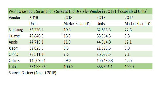 A principios de agosto, Canalyst ya anunció que Huawei superaba a Apple por primera vez en su historia como segundo vendedor de smartphones. En su último informe referido al segundo trimestre de 2018, Gartner corrobora este dato: la empresa china ocupa ya la segunda plaza del mercado mundial, por detrás de Samsung y relegando a la firma de la manzana al tercer escalón del pódium.
