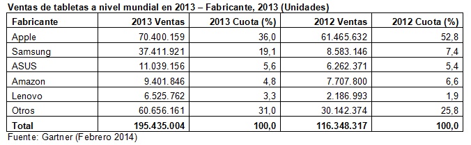 Las ventas mundiales de tabletas para usuario final alcanzaron 195,4 millones de unidades en 2013, un 68% de incremento sobre 2012, de acuerdo a Gartner. Mientras que las ventas de tabletas iOS crecieron en el cuarto trimestre de 2013, su cuota de mercado descendió un 36% en 2013. El aumento de tabletas en 2013 fue liderado por el mercado de dispositivos de pantalla pequeña de gama baja y la llegada de nuevos usuarios; ello permitió a Android ser número uno en sistemas operativos, con el 62% de participación del mercado.