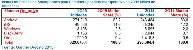 Gartner indica que las ventas de smartphones a nivel mundial han experimentado en el segundo trimestre de 2015 su crecimiento más bajo desde 2013. Así, las ventas para usuarios finales fueron de 330 millones de unidades, un incremento del 13,5% sobre el mismo periodo de 2014. «Mientras que la demanda para smartphones 3G y 4G de bajo coste ha continuado creciendo en mercados emergentes, a nivel global permanecía estable«, apunta Anshul Gupta, director de investigación en Gartner. Como dato, las ventas en China cayeron por primera vez año sobre año, con un 4% de bajada. «China es el mayor país de ventas de smartphnes, representando el 30% del total en el segundo trimestre del año, este pobre rendimiento se debe a su saturación«, afirma Gupta.