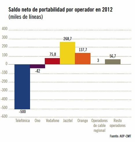 En cuanto a las operadoras, Movistar y Vodafonehan registrado un saldo negativo de 1,5 millones de portabilidades; mientras que los operadores virtuales han cerrado 2012 con una ganancia neta de 782.000 líneas portadas. En concreto, Telefónica ha perdido más de medio millón de números, mientras que Jazztel ha sumado 268.723 portabilidades. En lo que se refiere a nuevas líneas, los operadores alternativos captaron el 70% de las nuevas altas en banda ancha fija.