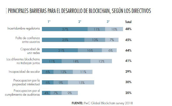 Los directivos son plenamente conscientes del gran potencial de la tecnología blockchain en el mundo de los negocios. Sin embargo, consideran que todavía existen una serie de obstáculos que están ralentizando su desarrollo. La incertidumbre regulatoria es, para el 48% de los entrevistados, la principal barrera, seguida de la falta de confianza, según el 45%, mientras que, para el 31%, el coste es la primera razón para la paralización de los proyectos.