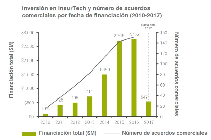 La disrupción está cambiando el modelo de negocio tradicional de seguros, centrando la atención en el cliente y en la creación de una gama completa de competencias digitales. En este contexto, la tendencia indica que las startups están jugando un papel fundamental en el desarrollo de soluciones que dan respuesta a las necesidades del sector. Así, desde 2010 la financiación total de InsurTech ha ascendido hasta los 9.200 millones de dólares en 287 startups. Y es que, solamente en 2016, la industria alcanzó los 2.700 millones de dólares y se espera que en 2017 esta tendencia se mantenga.