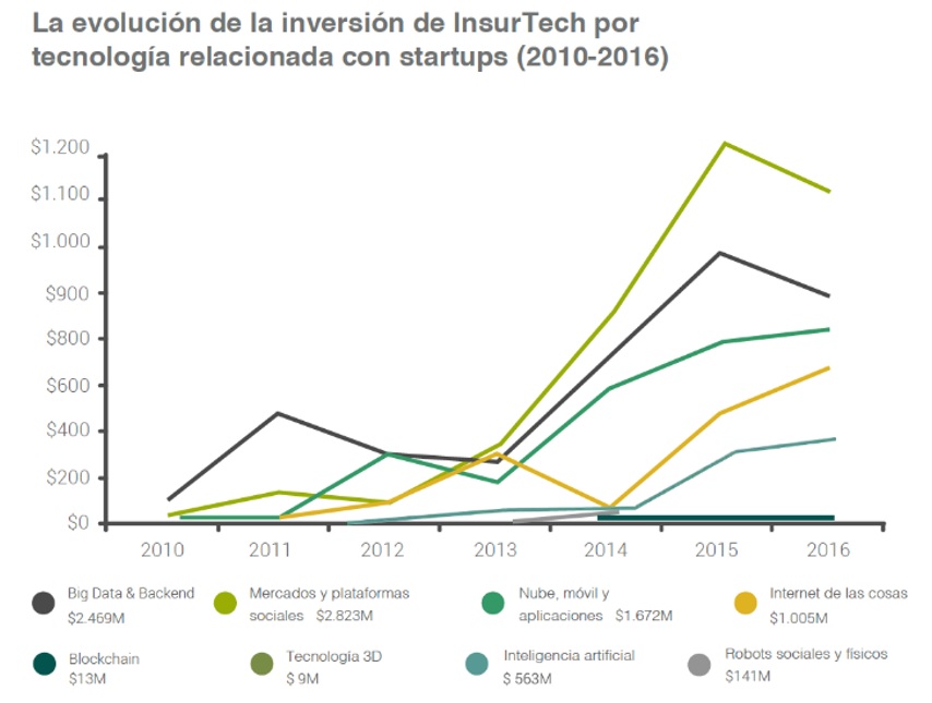 Las líneas de negocio de salud, automóvil y vida se han centrado principalmente en la inversión en IoT o Inteligencia Artificial durante 2016, pudiendo sugerir un interés en enriquecer los perfiles de comportamiento de los clientes y mejorar los modelos predictivos. Por su lado, la línea de negocio de hogar siguió apostando por inversiones en startups basadas en plataformas sociales, big data y tecnologías backend, lo cual podría indicar una búsqueda de niveles más altos de eficiencia en políticas de precio y evaluación de riesgos.