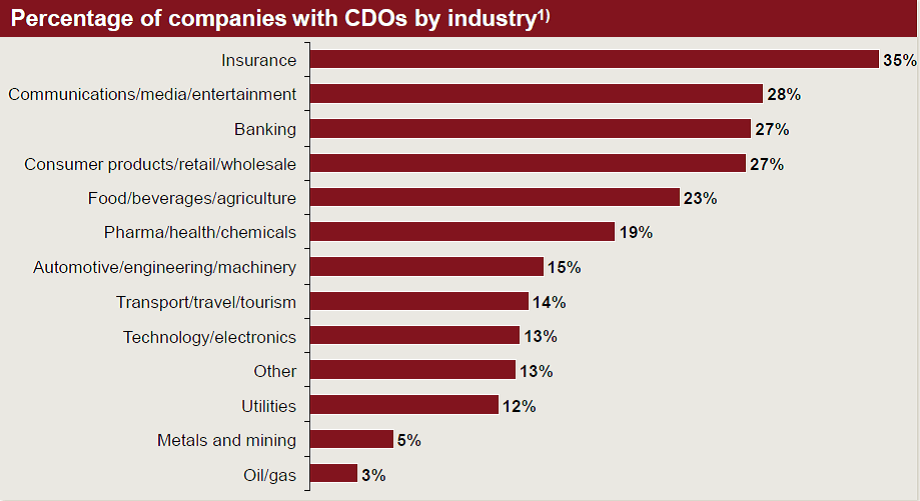 Si hacemos un análisis por sectores, las compañías que más están optando por el CDO son los bancos y las aseguradoras en un 62%, las de gran consumo en un 50% y las empresas de medios de comunicación, ocio y entretenimiento en un 28%; con el objetivo de mejorar la experiencia del cliente, la conectividad y transformar su modelo de negocio. Si lo hacemos por áreas geográficas, un 38% de las empresas cotizadas Europeas y un 23% de las de EEUU son la que más están apostando por esta figura. El 33% de las empresas españolas que se encuentran entre las 2.500 mayores cotizadas del mundo tienen CDO.Y si miramos el tamaño de la organización, las más grandes son las que más CDO tienen.