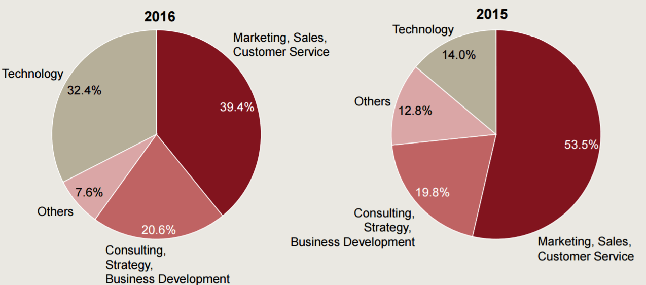 Pero, ¿de dónde viene la figura del Chief Digital Officer? ¿De fuera de la compañía? Y ¿qué formación tienen? Los nuevos líderes digitales proceden casi a partes iguales de dentro (52%) y de fuera (46%) de la compañía. Desde el punto de vista de su formación, el perfil ha variado en los últimos años. Si en 2015, solo el 14% de los responsables de la transformación digital eran expertos en tecnología, en 2016 este porcentaje se ha duplicado, llegando al 32%. No obstante, el estudio concluye que a la hora de contratar una persona para que lidere el proceso de transformación digital de una compañía, no solo es necesario tener en cuenta el expertise y el área de conocimiento de la persona sino también su posición y su capacidad para desenvolverse dentro de los órganos directivos de la compañía.
