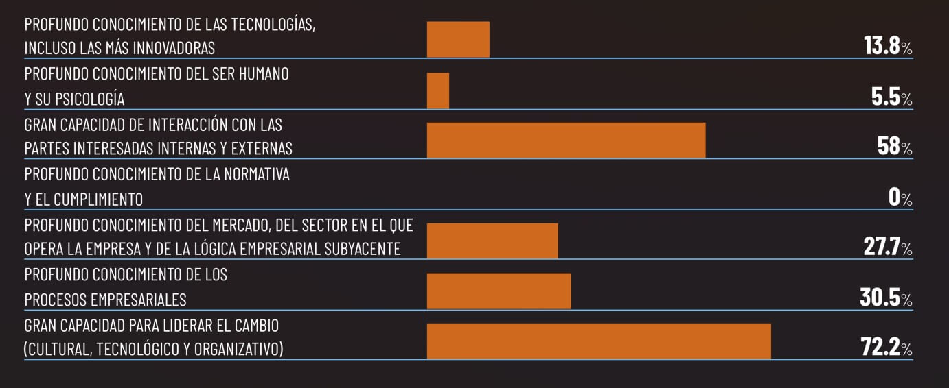 Si bien el 36,1% de los CIO se perciben a sí mismos como “el equilibrista” o, simultáneamente como “el simplificador” y “el innovador”, ambos con el 30,6% de las menciones; la competencia verdaderamente esencial para desempeñar la función de CIO es la capacidad para liderar el cambio, tanto cultural como tecnológico y organizativo, según un contundente 72,2% de los encuestados.