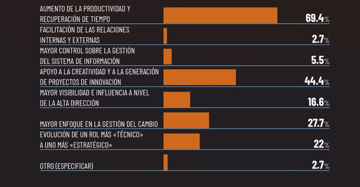 En cuanto a la Dirección de TI, el impacto de la IA en el trabajo de las personas es considerado “relevante” por el 52,8% de los encuestados. La IA provocará un cambio en las competencias requeridas al equipo (44,4%) y un aumento de la calidad de las actividades realizadas y del nivel de servicio (38,9%).