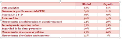 ¿Pero cuáles serán las tecnologías más importantes en la relación con los clientes y con el resto de grupos de interés? Un 61% de los ejecutivos españoles señala el potencial de las tecnologías de recogida y análisis de datos, porcentaje ligeramente inferior al registrado a nivel global (68%). Los sistemas de gestión comercial o CRM son otra de las tecnologías clave de cara a los próximos años -para el 61% de los CEOs españoles y el 65% de los ejecutivos a nivel global-, seguidas por las iniciativas relacionadas con la Innovación e I+D -para el 50% de los ejecutivos españoles y el 53% de los mundiales-. Por último, los ejecutivos -43% españoles versus 50% globales- señalaron las tecnologías relacionadas con la escucha y la fidelización de clientes, y en concreto, a la comunicación en redes sociales, como otra de las herramientas con mayor potencial.