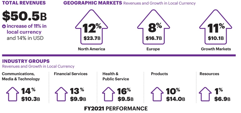 La facturación de Accenture correspondiente a su último ejercicio fiscal se ha situado en 50.500 millones de dólares, lo que supone un crecimiento del 11% en moneda local respecto al ejercicio anterior. Todas sus áreas de negocio han reportado un aumento de su negocio; estas cinco áreas son: Salud y Servicio Público (+16%); Comunicaciones, Media y Tecnología (+14%); Servicios Financieros (+13%); Fabricación, Distribución y Consumo (+10%) y Resources (+1%).