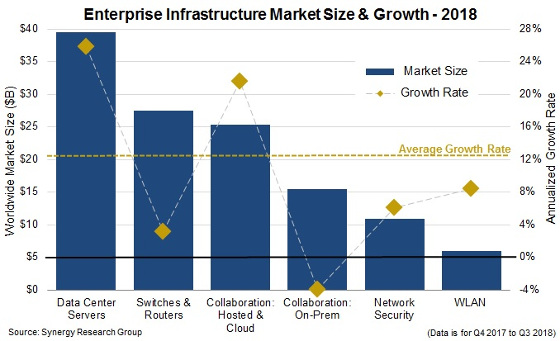 Cisco sigue siendo el proveedor empresarial dominante, siendo el líder del mercado en la mayoría de los segmentos, de acuerdo con ese informe. En total, en todos los segmentos, la participación de mercado de la compañía en los últimos cuatro trimestres fue del 23%, dos puntos porcentuales menos que en 2017. Esto se debió principalmente al crecimiento del negocio de servidores, donde la firma se posiciona como el quinto proveedor. En los otros segmentos, su participación de mercado se mantuvo relativamente constante.