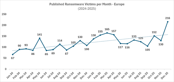 Víctimas de ransomware publicadas por mes – Europa (2024-2025)