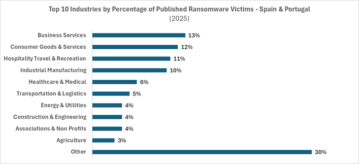Las 10 principales industrias por porcentaje de víctimas de ransomware publicadas – España y Portugal (2025)