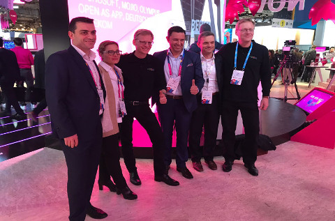 La firma del acuerdo se ha realizado en el marco del Mobile World Congress (MWC) que se celebra estos días en Barcelona. La ceremonia tuvo lugar en el stand del Grupo Deutsche Telekom (3M31). De izquierda a derecha: Miguel Ángel Sánchez del Pilar, Head of Telecomunications Solutions & Services de T-Systems Iberia; Rosa María Rodríguez, VP Sales de T-Systems Iberia; Marcus Hacke, fundador y director general de ngena; Osmar Polo, Managing Director de T-Systems Iberia; Alessandro Adriani, director general de ngena; Lars Schuett, Head of Partner Management en ngena.