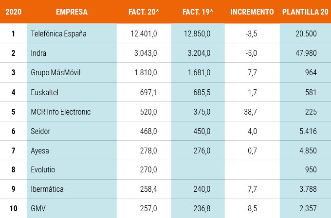 Las operadoras han sido las grandes triunfadoras del cuanto menos atípico 2020. Telefónic?a, MásMóvilyEuskaltel se encuentran entra las diez compañías de origen español que han conseguido mejores resultados en el mercado TIC de nuestro país, -con 12.401, 1.810 y 697,1 millones de euros de facturación respectivamente-; estando la primera a la cabeza no solo de la lista empresas nacionales, sino también a nivel internacional.