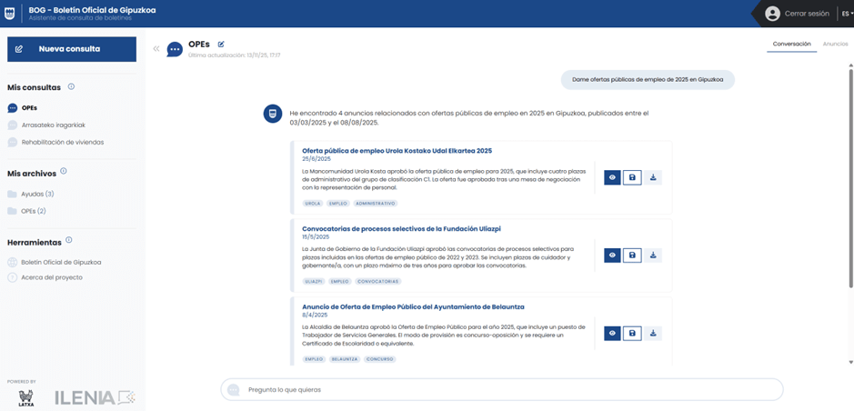 Un ejemplo es el demostrador desarrollado por LKS Next GobTech junto con HiTZ (Centro Vasco de Tecnología de la Lengua) y EHU dentro del proyecto ILENIA: un asistente conversacional sobre el Boletín Oficial de Gipuzkoa que impulsa el uso de las lenguas cooficiales en la Inteligencia Artificial. Esta herramienta permite a cualquier persona formular preguntas en lenguaje natural y obtener respuestas claras y trazables. Cualquier usuario puede preguntar “¿Qué condiciones debo cumplir para esta ayuda?” y recibir una respuesta precisa, en una interfaz multilingüe y que incluye referencias directas al texto oficial. No funciona como un buscador convencional que busca por palabras clave: interpreta la consulta y transforma la complejidad normativa en conocimiento útil.