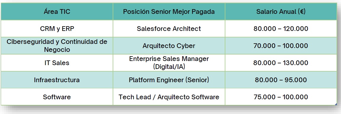 En perfiles senior, los salarios más elevados corresponden al Platform Engineer, al Cloud Architect y al responsable de Infraestructuras, todos ellos con bandas que alcanzan o superan los 95.000 euros anuales.
