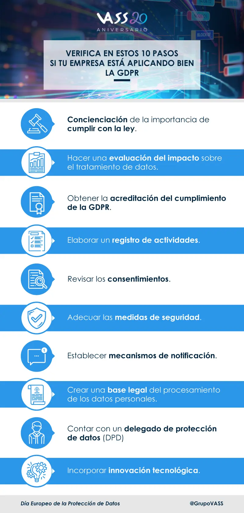 Este lunes 28 de enero se celebra el Día Europeo de la Protección de Datos y la consultora especialista en soluciones digitales VASS ha elaborado un decálogo con los requisitos que las empresas deben aplicar –si no lo han hecho ya– para cumplir con el Reglamento Europeo de Protección de Datos (GDPR, por sus siglas en inglés) y evitar sanciones que pueden elevarse hasta los 20 millones de euros o el 4% de la facturación anual del ejercicio anterior: