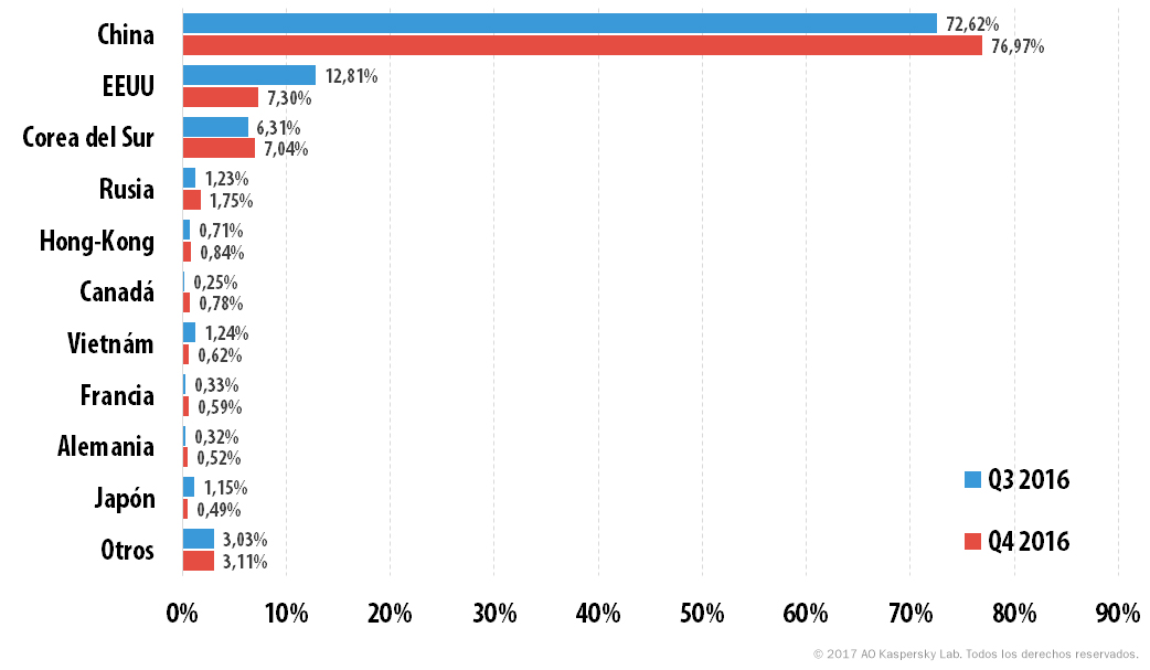 En el cuarto trimestre de 2016, se alertó sobre este tipo de ataques en más de 80 países, comparado con los 67 países del trimestre anterior. La lista de los 10 países con el mayor número de víctimas DDoS también sufrió cambios, con la incorporación de Alemania y Canadá sustituyendo a Italia y Países Bajos. Tres países de Europa occidental (Países Bajos, Reino Unido y Francia) siguen a la cabeza entre los 10 países con el mayor número de servidores C&C alojados por segundo trimestre consecutivo, a los que en el cuarto trimestre se les han unido Bulgaria y Japón.