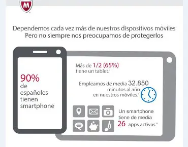 De media, los usuarios europeos de telefonía móvil tienen 26 aplicaciones activas en sus teléfonos móviles. Las aplicaciones son la principal forma en la que el malware se puede descargar en los smartphones o tablet y donde muchos cibercriminales hacen que una aplicación maliciosa parezca segura para que encuentre la manera de salir en las tiendas de aplicaciones de confianza. De hecho, los laboratorios McAfee Labs™ han visto que más del 80% de las aplicaciones de Android rastrean y recopilan información personal y, respecto al software malicioso, el 35% de estas aplicaciones son intrusivas en la privacidad.