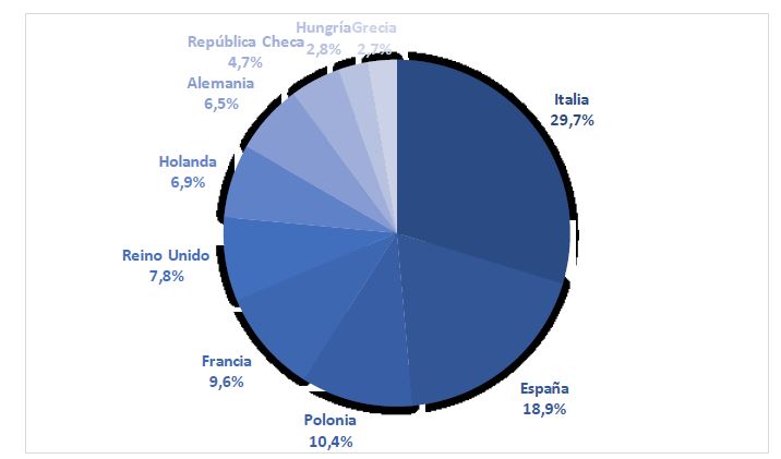 El resto del listado lo conforman Bélgica (2,22%), Eslovaquia (2,00%), Rumania (1,96%), Croacia (1,32%), Bulgaria (1,20%), Irlanda (1,13%), Eslovenia (1,09%), Suecia (1,02%), Austria (0,87%), Portugal (0,78%), Lituania (0,77%), Chipre (0,30%), Dinamarca (0,24%), Luxemburgo (0,19%), Letonia (0,15%), Estonia (0,11%), Malta (0,04%) y Finlandia (0,02%).
