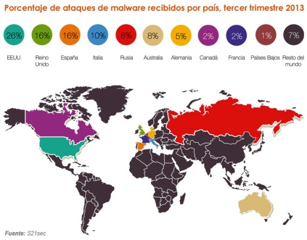A pesar de ser aún el tercer país más atacado del mundo, s21sec asegura que la tendencia es descendente en España pues el nivel de ciberataques está disminuyendo, por lo menos en la modalidad de troyanos bancarios.