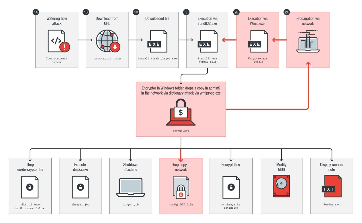 En su análisis inicial Trend Micro ha descubierto que Bad Rabbit se propaga a través del tipo watering hole(*) que dirigen al instalador de Flash falso «install_flash_player.exe». Los sitios comprometidos se inyectan con un script que contiene una URL que se resuelve en hxxp: // 1dnscontrol [.] Com / flash_install, y que esta inaccesible a partir del momento de la publicación. En Trend Micro hemos observado algunos sitios comprometidos en Dinamarca, Irlanda, Turquía y Rusia, donde se entregó el instalador Flash falso.