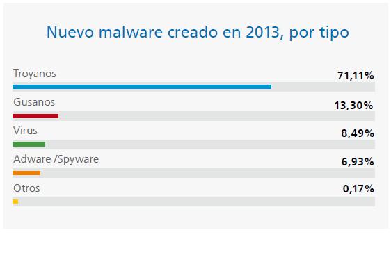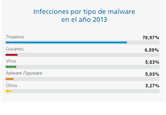 Si analizamos las infecciones causadas por el malware en el mundo, vemos cómo también los troyanos, con un 78,97% de los casos, encabezan el ranking. A mucha distancia siguen los virus (6,89%) y los gusanos (5,83%). “Parece que los ciberdelincuentes han conseguido en 2014 infectar con troyanos más ordenadores que en años anteriores. En 2011 el porcentaje de PCs infectados con troyanos fue del 66%, y en 2012 llegó hasta un 76%, consolidándose la tendencia de uso de este tipo de malware”.