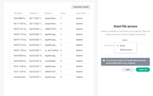 C2 Transfer ofrece una plataforma de transferencia controlada por los usuarios que les permite monitorear y regular todas las funciones de las tareas de transferencia. La aplicación optimiza la seguridad general de la transferencia al proteger los datos enviados mediante la autenticación del destinatario a través de la dirección de correo electrónico o el número de teléfono. También permite establecer una fecha de vencimiento del enlace compartido y asegura el cifrado de archivos de un extremo a otro sin necesidad de que el destinatario tenga que registrarse.