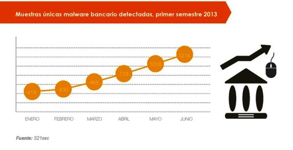 En cuanto al malware bancario detectado por S21sec, que se ha triplicado en el primer semestre de 2013, expertos de esta firma experta en seguridad especifican que, “a pesar del relativo estancamiento que se produjo en 2012, parece que los creadores de malware han decidido recuperar el tiempo perdido, y en este semestre hemos detectado y analizado más de dos millones de troyanos y cerca de 135.000 muestras de malware bancario”.