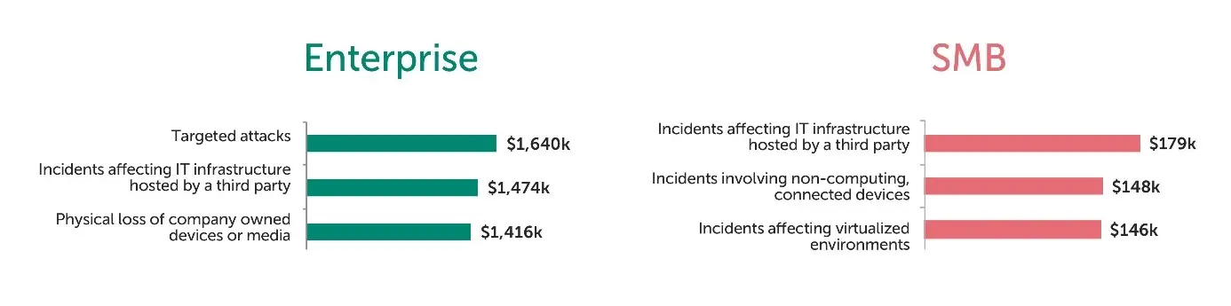 Dos de cada tres de los incidentes de ciberseguridad más costosos que afectan a pymes están relacionados con la nube, donde un problema con la infraestructura de TI alojada en terceros llega a alcanzar un coste medio de 150 mil €. Para las empresas grandes, la protección de datos sigue siendo la principal prioridad, con un coste medio de hasta 1,4 millones de € en las brechas de seguridad de datos, y de 1,2 millones de € en el caso de incidentes que afectan a la infraestructura TI de terceros.