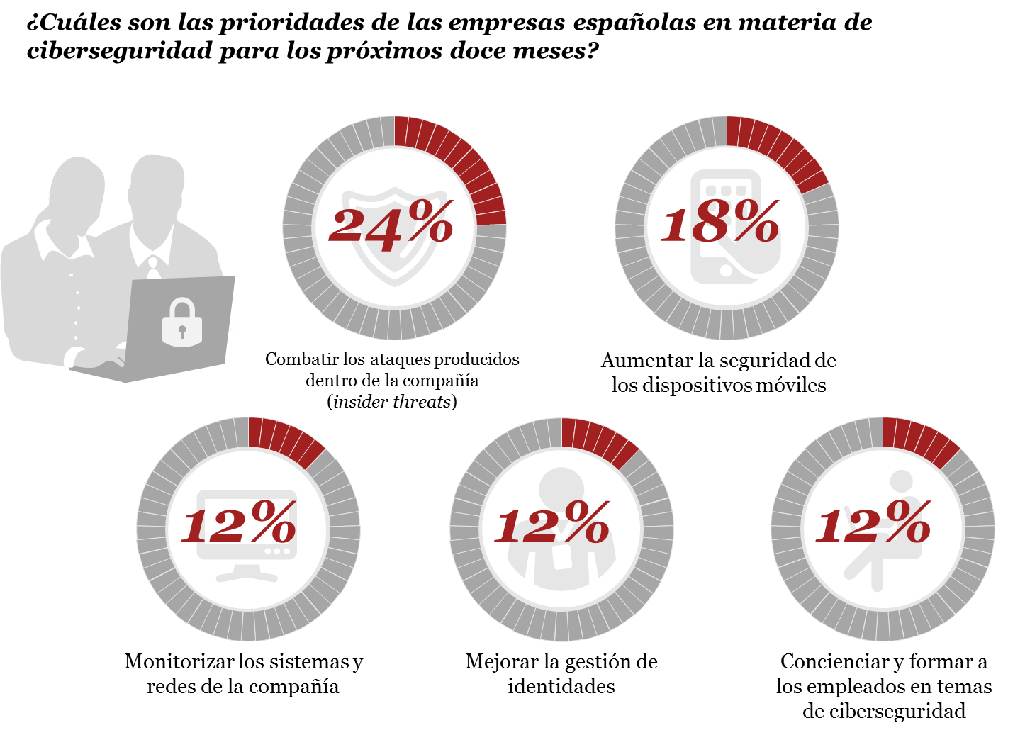 En los próximos doce meses, según el informe, estas prioridades pasan por combatir los ataques que se producen desde dentro de la organización–insider threats-; garantizar la seguridad de los dispositivos móviles;monitorizar los sistemas y redes de la compañía; mejorar la gestión de identidades y aumentar la conciencia y la formación de los empleados sobre los riesgos informáticos a los que se enfrenta la empresa.