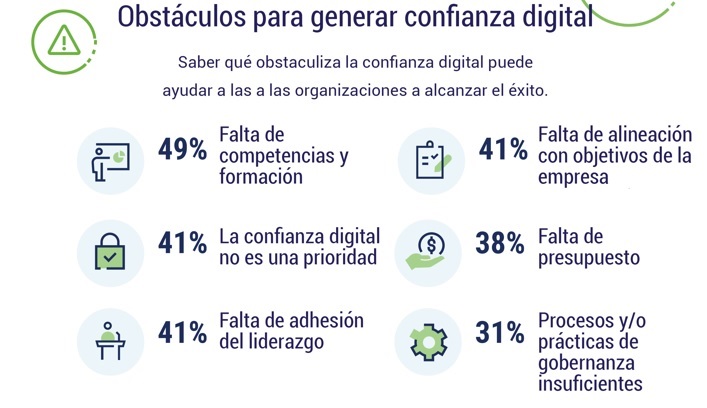 Existen varias barreras para lograr la confianza digital. Según la investigación, el 41% de los encuestados citan tanto la falta de compromiso de los líderes como la falta de alineación entre la confianza digital y los objetivos de la empresa como obstáculos para el progreso. Un número similar (38%) señala que la falta de presupuesto es un obstáculo, lo que indica que las empresas luchan por encontrar los recursos y las razones para mejorar la fiabilidad de su organización.