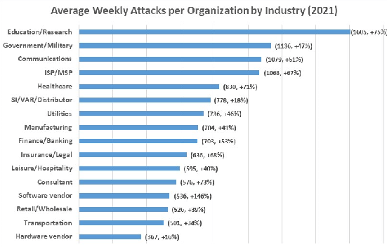 En 2021, la educación/investigación fue el sector que experimentó el mayor volumen de ofensivas, con una media de 1.605 ataques por organización cada semana. Esto supuso un crecimiento del 75% respecto a 2020. Le siguieron el ramo gubernamental/militar, que tuvo 1.136 asaltos por semana (47% de subida), y la industria de las comunicaciones, que tuvo 1.079 por organización (51% de incremento).