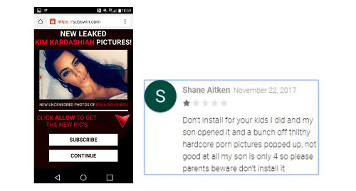 - Anuncios inapropiados y pornográficos: El elemento más impactante de este malware es que hace que aparezcan anuncios de pornografía sin previo aviso en la pantalla sobre la app infantil legítima.