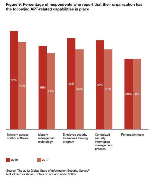 Finalmente, en relación a las amenazas y ataques de seguridad, en esta edición ha despuntado el llamado Advanced Persistent Threat (ATP), que es un nuevo tipo de ataque organizado que tiene por objetivo los sistemas de organizaciones internacionales, fuerzas y cuerpos de seguridad o gobiernos. Aunque estas amenazas todavía se centran en instituciones del sector público o la política, la encuesta señala que las compañías del sector privado también deben desarrollar protocolos de seguridad en esta línea. Es más, muchos entrevistados explican que su inversión en seguridad aumenta, de forma indirecta, su protección ante los ATP.